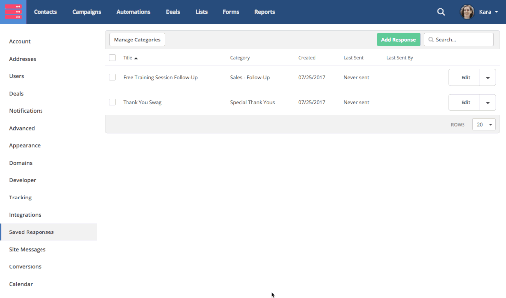 要建立個人電郵模板,可以在設定(Settings)中的個人電郵模板(Saved Responses)頁面,點擊新增個人電郵模板(Add Response)。您還可以使用個人代碼“%”把聯絡人的個人資料加到電郵之內,做出更加個人化的電郵內容。
