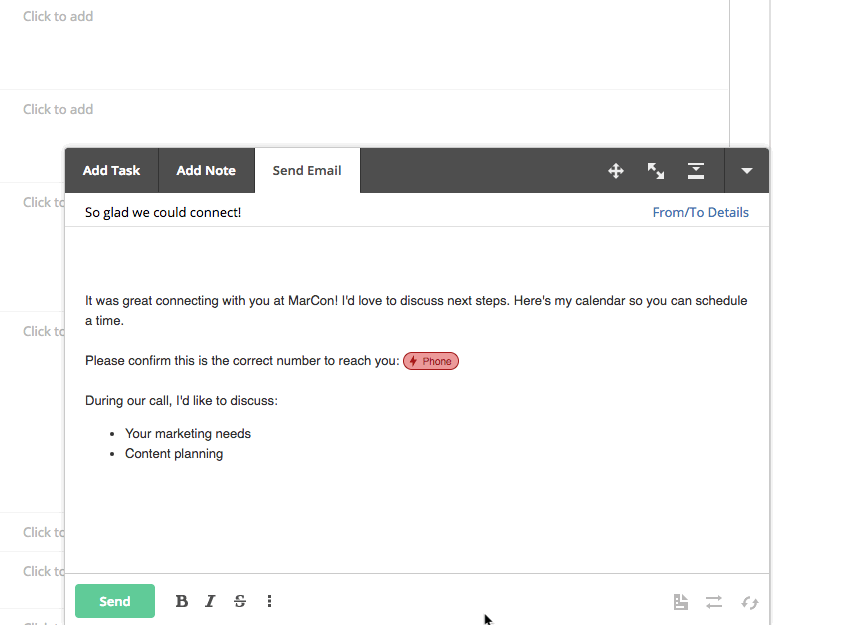 在交易機會(Deals)的頁面中點擊發送電郵(Send Email),再點擊電郵內容右下角的個人電郵模板圖示,然後選取想要使用的個人電郵模板。