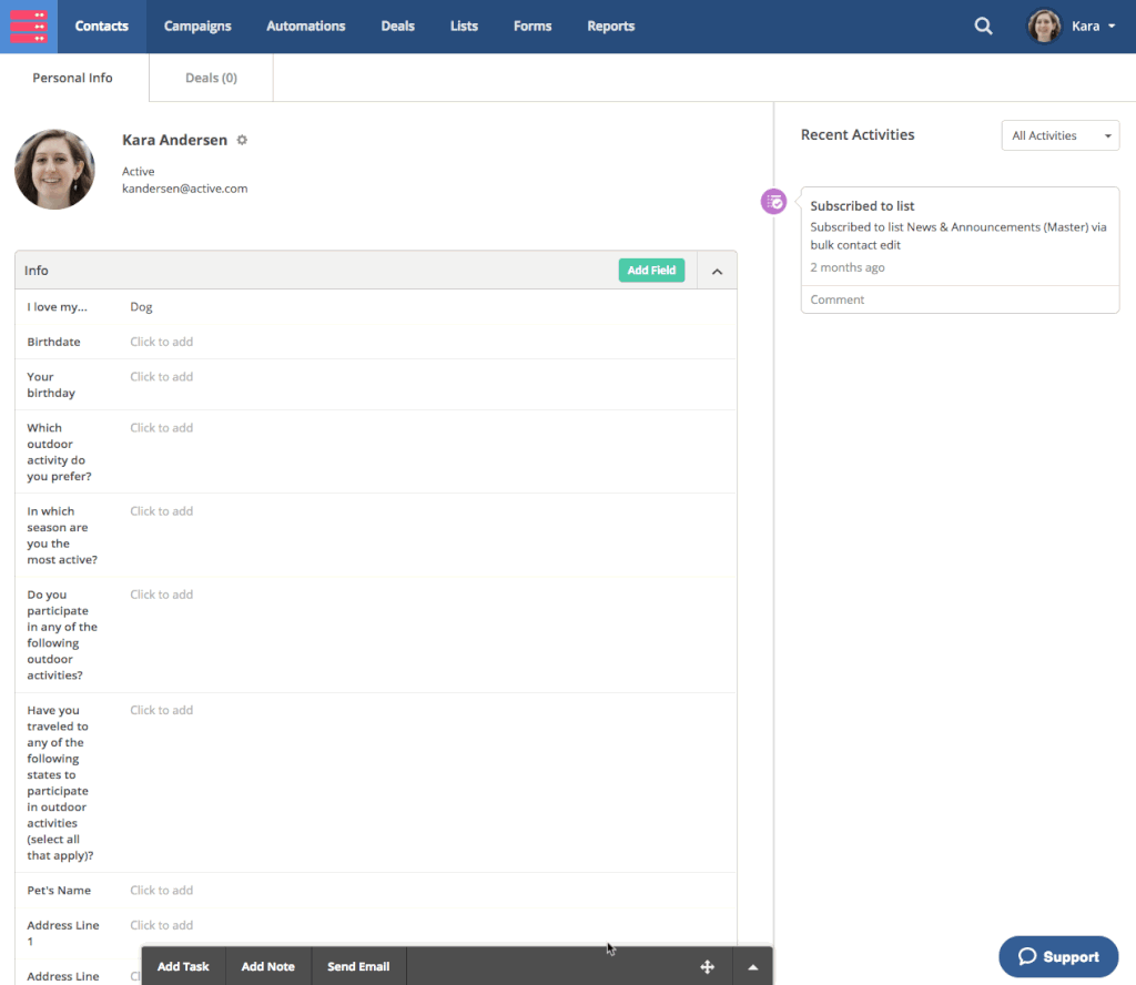 營銷電郵模板(Templates)是在電郵營銷(Campaigns)和自動營銷(Automations)中發送營銷電郵時使用,而個人電郵模板(Saved Responses)則是在聯絡人(Contacts)和交易機會(Deals)中發送個人電郵時所使用。在聯絡人(Contacts)的個人資料(Personal Info)頁面上,您可以在最近互動(Recent Activities)中查閱到發送給聯絡人的個人電郵記錄,但是您並不能追蹤聯絡人在個人電郵中點擊連結的互動行為。