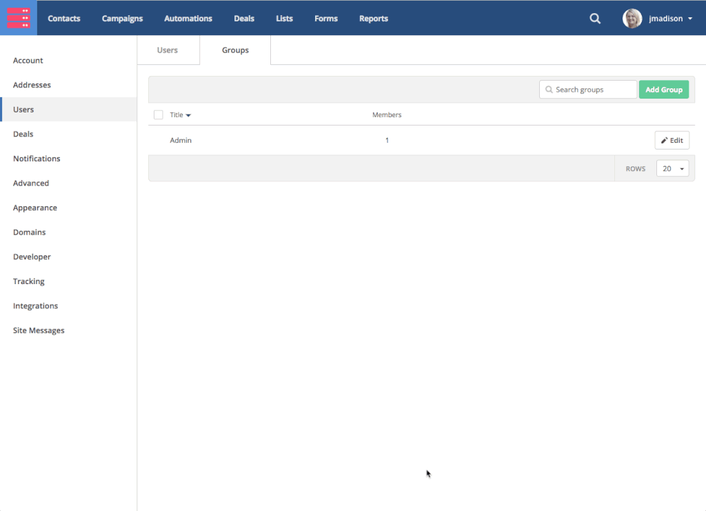在功能權限(Permissions)中設定用戶群組對各個功能的使用權限,包括列表(Lists)、電郵營銷(Campaigns)、聯絡人(Contacts)、表格(Subsription Forms)、營銷電郵模板(Templates)、報表(Reports)及交易機會(Deals)等。