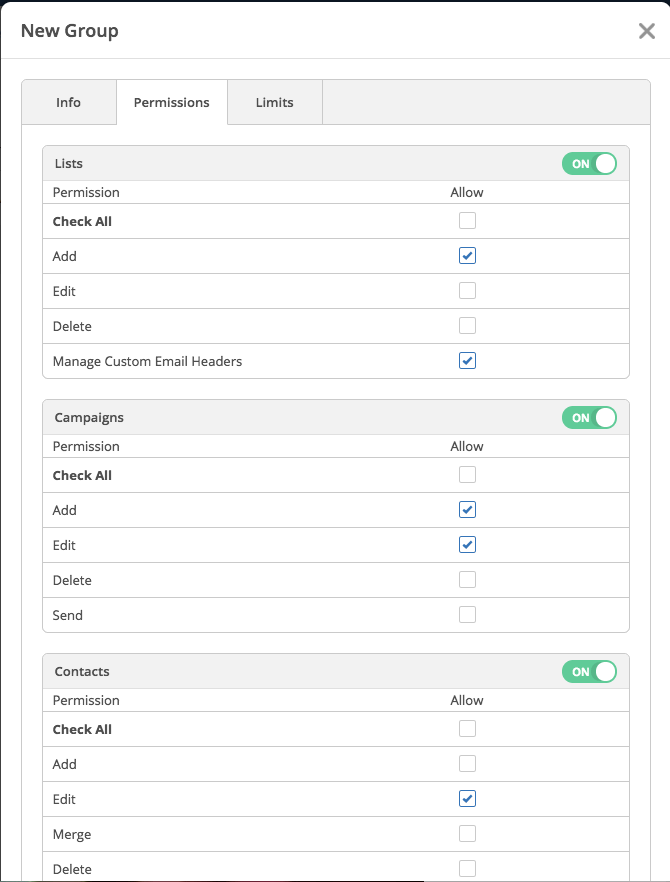 在使用限制(Permissions)中設定用戶群組的使用限制(Limits),當中包括每月發送電郵總數(Limit emails sent)、每月新增聯絡人總數(Limit number of contacts)、每月建立列表總數(Limit number of lists)和每月建立電郵營銷總數(Limit number of campaigns)等。