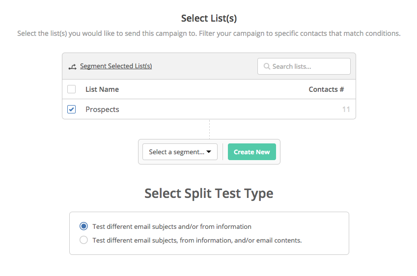 在分組測試的設定畫面中,可供測試的選項有電郵標題(subjects)、寄件人訊息(from information)和營銷電郵內容(email contents)。