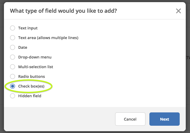 在表格的編輯畫面中點擊新增自定欄位(Add Custom Field),再選擇複選框(Check box(es)),然後按下一步(Next)。