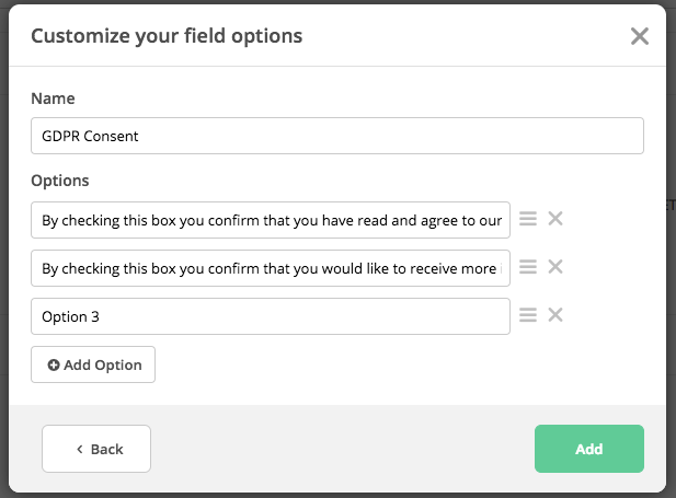 在複選框的設定畫面中輸入訂閱通訊的清楚說明後,再點擊新增(Add)。