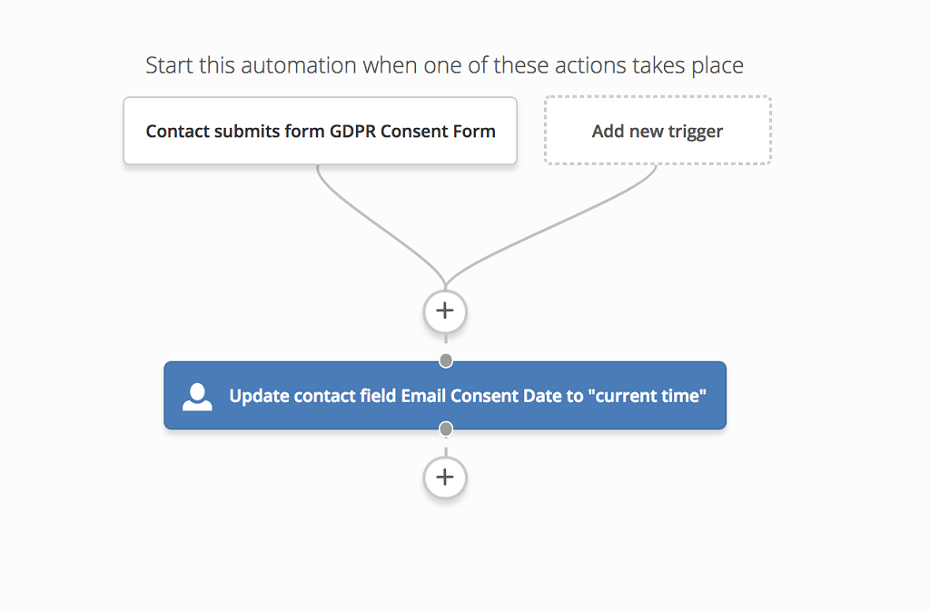 您還可以在自動營銷功能(Automations)中,選擇提交表格(Submits a form)作為啟動觸發器,再替流程中的聯絡人更新欄位內容(Update contact),這樣便可以把他們的訂閱通訊日期儲存到聯絡人的個人資料之內。