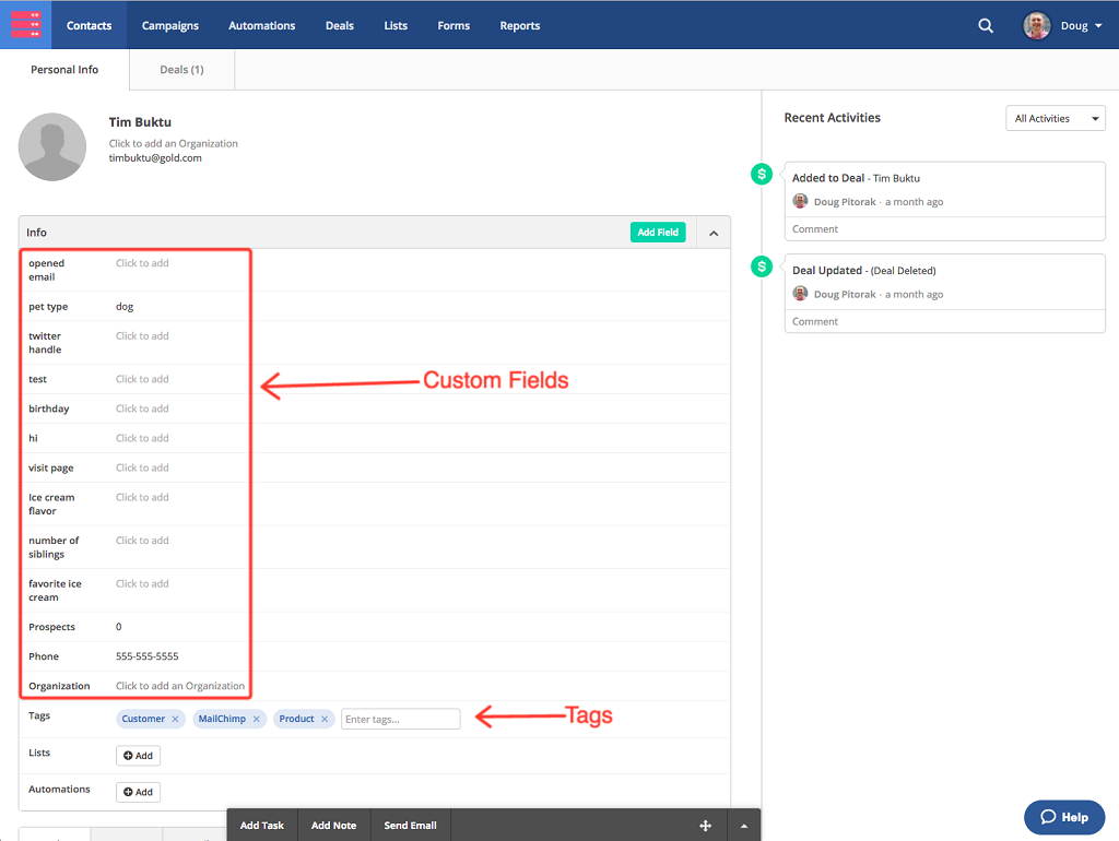 自定欄位(Custom Fields)和標籤(Tags)的用途十分相似,同樣可以在細分群組、啟動觸發器和動態內容時所使用。您可以替聯絡人更新他們在自定欄位中所儲存的資料內容,但標籤則只可以替聯絡人進行附加或移除。每個自定欄位都會自動產生一個個人代碼,您可以在營銷電郵中使用這個個人代碼來把聯絡人的個人資料顯示出來。
