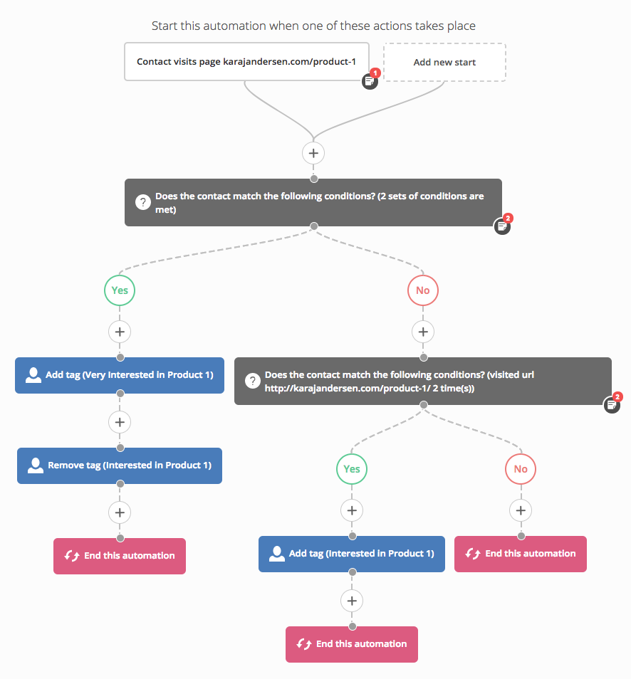 在一個用來追蹤聯絡人對商品喜好程度的自動營銷流程中,選擇瀏覽網頁(Web page is visited)作為啟動觸發器,利用如果/否則(If/Else)去判斷聯絡人是否有瀏覽過商品網頁2次或以上,再替瀏覽過商品網頁只有1次的聯絡人附加標籤(Add tag)“Interested in Product 1”,並替瀏覽過商品網頁2次或以上的聯絡人附加標籤(Add tag)“Very Interested in Product 1”和移除標籤(Remove tag)“Interested in Product 1”。