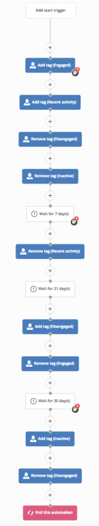 在一個用來追蹤聯絡人對您熱衷程度的自動營銷流程中,替流程中的聯絡人附加標籤(Add tag)“Engaged”和“Recent activity”,並移除標籤(Remove tag)“Disengaged”和“Inactive”。等待(Wait)7天後,再替流程中的聯絡人移除標籤(Remove tag)“Recent activity”。然後等待(Wait)21天後,再替流程中的聯絡人附加標籤(Add tag)“Disengaged”和移除標籤(Remove tag)“Engaged”。最後等待(Wait)30天後,再替流程中的聯絡人附加標籤(Add tag)“Inactive”和移除標籤(Remove tag)“Disengaged”。