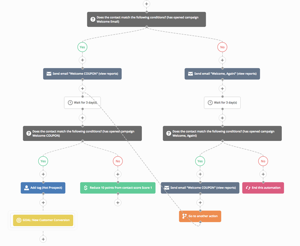 在發送迎新提醒電郵的營銷路線中,等待(Wait)3天後,利用如果/否則(If/Else)去判斷各聯絡人是否有開啟電郵,然後再替有開啟電郵的聯絡人跳到位置(Go To)到發送迎新優惠電郵的營銷路線,並替沒有開啟電郵的聯絡人結束自動營銷流程(End this automation)。