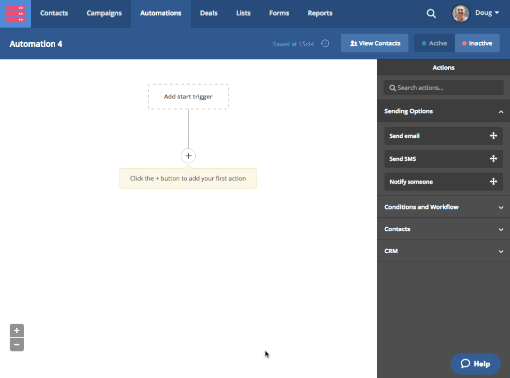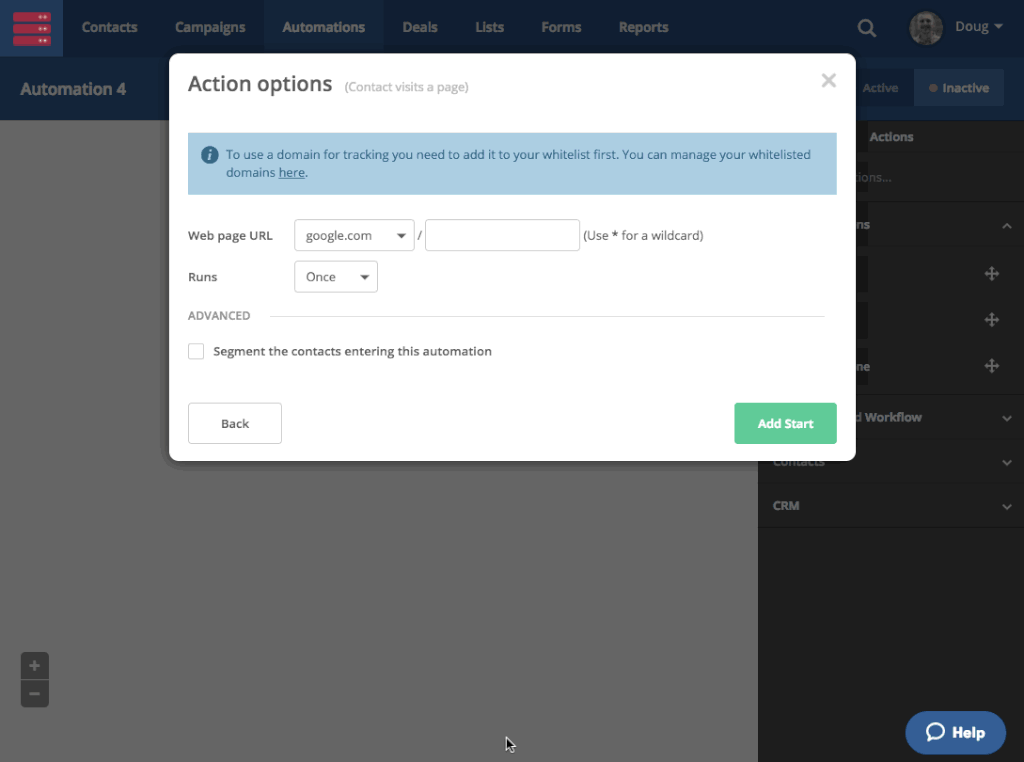 在自動營銷(Automations)功能中,可供選用的啟動觸發器包括有訂閱列表、取消訂閱、提交表格、開啟電郵、點擊連結、瀏覽網頁、操作記錄、分享電郵、轉發電郵、回覆電郵、附加標籤、移除標籤、欄位更新、達成目標、日期觸發、RSS觸發、完成購買、調整評分、交易管道、交易階段和交易狀態等。您還可以同時把多個啟動觸發器增加到一個自動營銷流程之中,讓符合不同條件的聯絡人都能夠啟動該自動營銷流程。