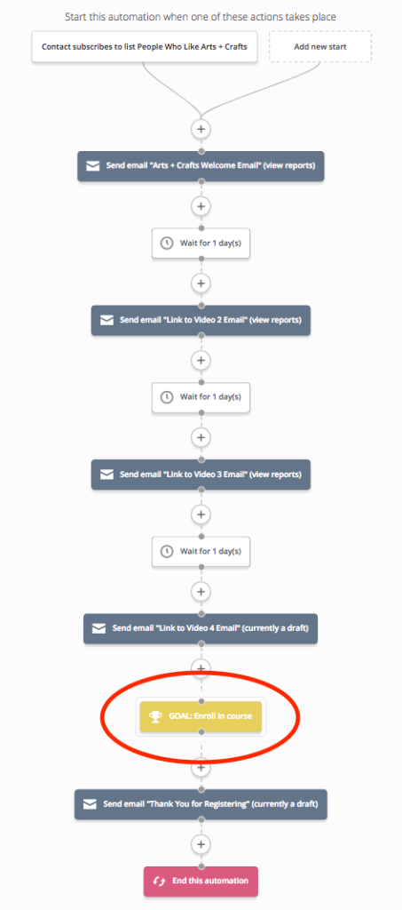 例如在一個用來推廣網上課程的自動營銷流程中,選擇訂閱列表(Subscribes)作為啟動觸發器,再向流程中的聯絡人發送網上課程的推廣電郵系列(Send email),並使用達成目標(Goal)把所有完成註冊的聯絡人立即跳到達成目標的所在位置,然後向他們發送完成註冊的感謝電郵(Send email)。