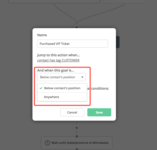 注意:無論聯絡人當時正在自動營銷流程中的任何位置,當他們符合了達成目標的條件便會立即跳到達成目標的所在位置再繼續前進。