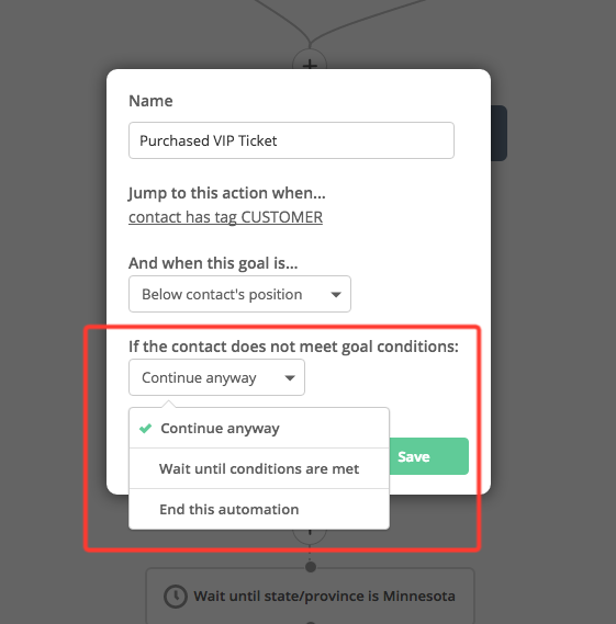 為未能達成目標的聯絡人選擇在流程中繼續前進(Continue anyway)、繼續等待直至符合條件(Wait until conditions are met)或立即結束自動營銷流程(End this automation)。