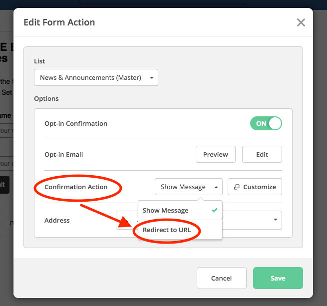您可以設定當聯絡人確認訂閱後所顯示的感謝訊息(Show Message),或是把他們重新導向(Redirect to URL)到一個由您所指定的網頁。假如表格的目的就是要讓聯絡人在完成註冊後才能下載某指定文件,那您就可以把他們重新導向到一個用來下載該指定文件的網頁上。