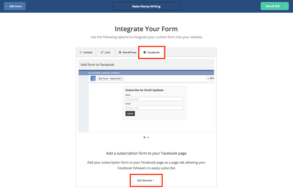 您也可以選擇把表格整合到您的Facebook專頁,這樣便可以從Facebook中收集聯絡人數據。在表格整合(Integrate)的Facebook選項中,點擊開始整合(Get Started)。