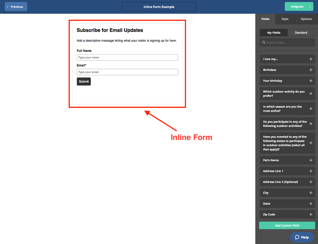 內置表格(Inline Form)的用途有別於其餘三種表格模式,它除了可以用來收集聯絡人的姓名和電郵地址外,您還可以替它增加其他資料欄位來收集更多有關聯絡人的個人資料。