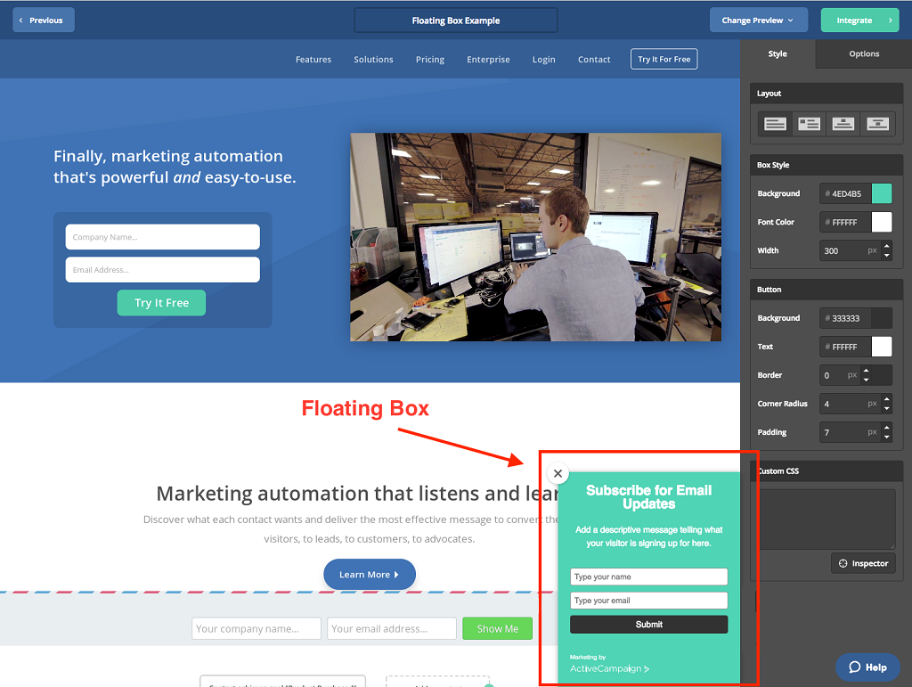 浮動框表格(Floating Box)和浮動欄表格(Floating Bar)的使用性質相同,都是用來收集聯絡人的姓名和電郵地址,您可以選擇把它設置在網頁上的左下角或是右下角。