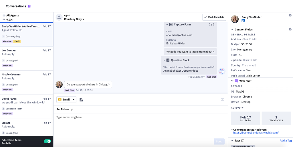 在網上聊天(Conversations)頁面中,您可以看到聯絡人的個人資料,並與他們進行即時對話或是向他們發送個人電郵。您還可以使用已預先儲存好的聊天內容去回覆他們,以提高您的工作效率。