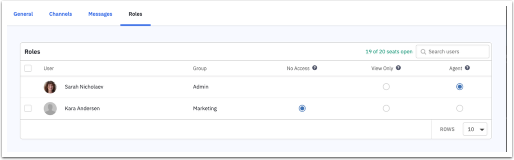 在網上聊天(Conversations)的用戶權限(Roles)中,您可以把內部團隊成員在網上聊天功能中的使用權限分別設定為沒有權限(No Access)、只限查閱(View Only)及操作用戶(Agent)。