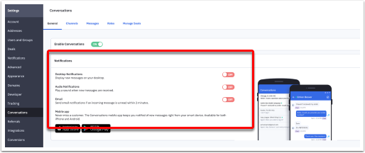 在網上聊天(Conversations)的一般設定(General)中開啟網上聊天通知(Enable Conversations),再開啟可供選用的通知模式包括有訊息通知(Desktop notifications)、聲音通知(Audio notifications)和電郵通知(Email notifications)等,然後每當有聯絡人在網上聊天中發送訊息給您時,您便會收到相關通知。