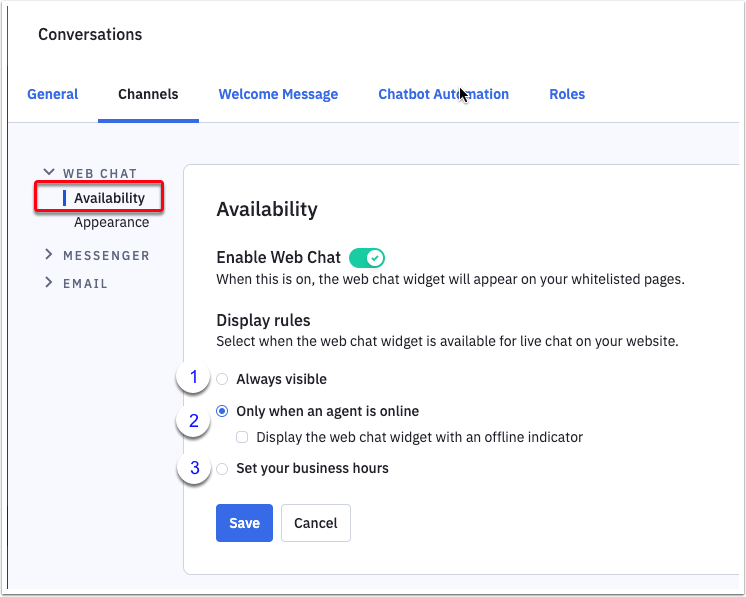 在網上聊天(Conversations)的聊天頻道(Channels)中開啟網上聊天功能(Enable Web Chat),再設定它的工作時間。在工作時間中的選項包括有經常開啟(Always visible)、當有內部團隊人員在線時才開啟(Only when an agent is online)或是在指定工作時間內開啟(Set your business hours)。