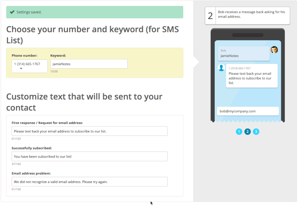 輸入活動邀請的訊息內容後,再按儲存設定(Save Settings)。以後您仍然可以隨時在列表(Lists)上,選擇訂閱列表SMS(Subscribe by SMS)來更改已經設定好的訊息內容。