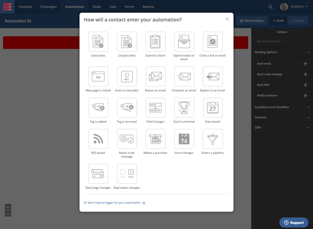 訂閱列表SMS並沒有確認訂閱功能,所有經SMS通訊來完成活動註冊的聯絡人都將會被直接增加到您的列表之中,因此您可以使用自動營銷功能去對聯絡人所提供的電郵地址進行確認。在自動營銷(Automations)頁面中,點擊新增自動營銷流程(New Automation),選擇訂閱列表(Subscribes)作為啟動觸發器,再選取剛才建立那個列表。