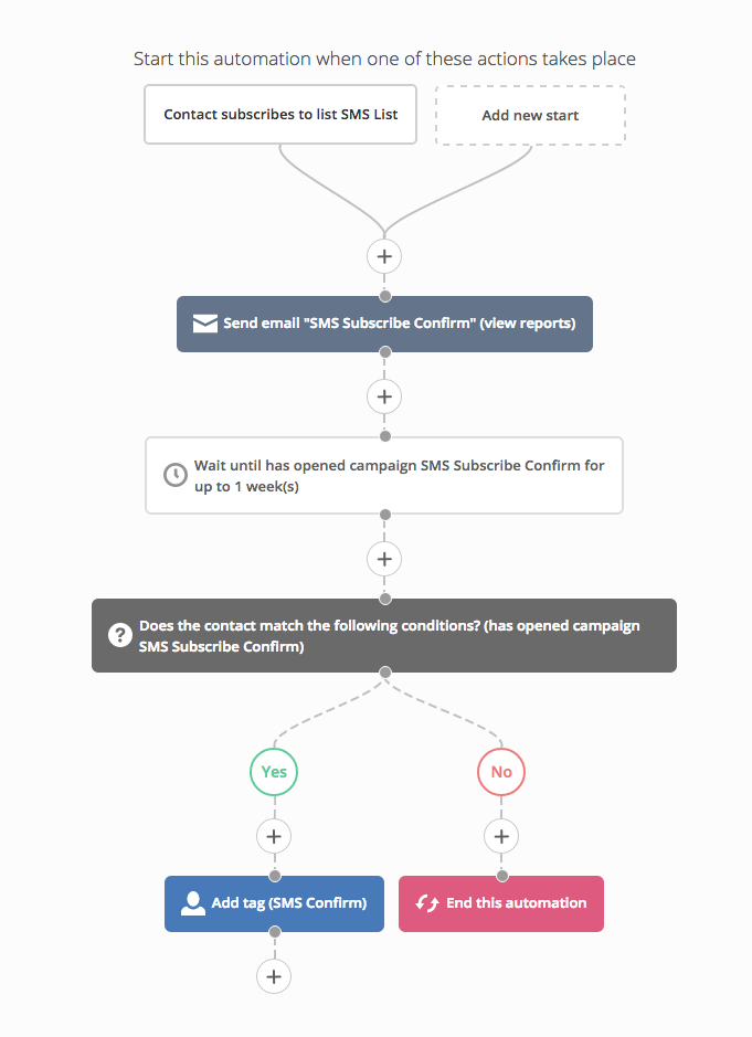 在自動營銷流程中增加向聯絡人發送確認訂閱電郵(Send email)的操作步驟,再通過如果/否則(If/Else)操作條件替開啟電郵的聯絡人附加標籤(Add tag),以標示他們的電郵地址為正確有效。
