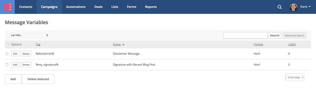 在電郵營銷(Campaigns)頁面中點擊管理訊息代碼(Manage Variables),再按新增(Add)。