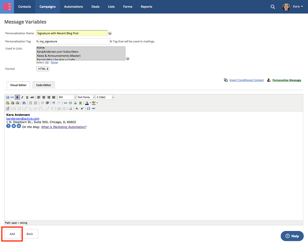 先把訊息代碼(Variables)的代碼(Personalization Tag)設定為%MY_SIGNATURE%,編輯好您的簽名內容後再按增加(Add)。然後您便可以隨時在電郵營銷或自動營銷中的營銷電郵內,通過輸入%MY_SIGNATURE%來把您的簽名內容顯示出來。