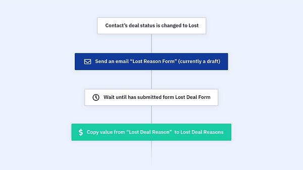 每當有聯絡人在交易管道中的交易狀態被變更為交易失敗時,自動營銷流程便會自動向他們發送含有用來調查交易失敗原因表格的跟進電郵。