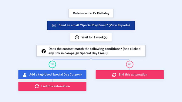 每當有聯絡人的生日日期即將來到時,自動營銷流程便會自動向他們發送生日優惠電郵。