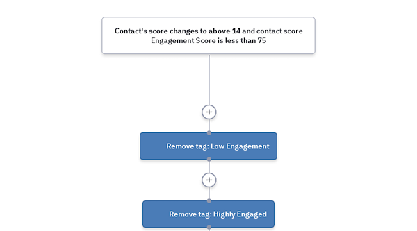 2. 在流程中替擁有中等評分的聯絡人移除標籤”Low Engagement”(Remove tag)和移除標籤“Highly Engaged”(Remove tag)。