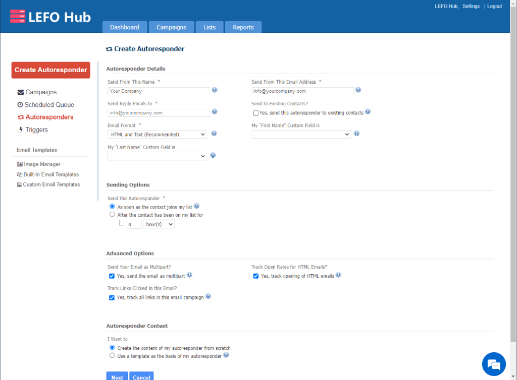如要設定自動回覆功能,先在電郵營銷(Campaigns)的自動回覆(Autoresponders)頁面中點擊新增自動回覆(Create Autoresponder),再設定好自動回覆的名稱及條件後,便可以開始在電郵編輯器中去建立您的自動回覆電郵內容。